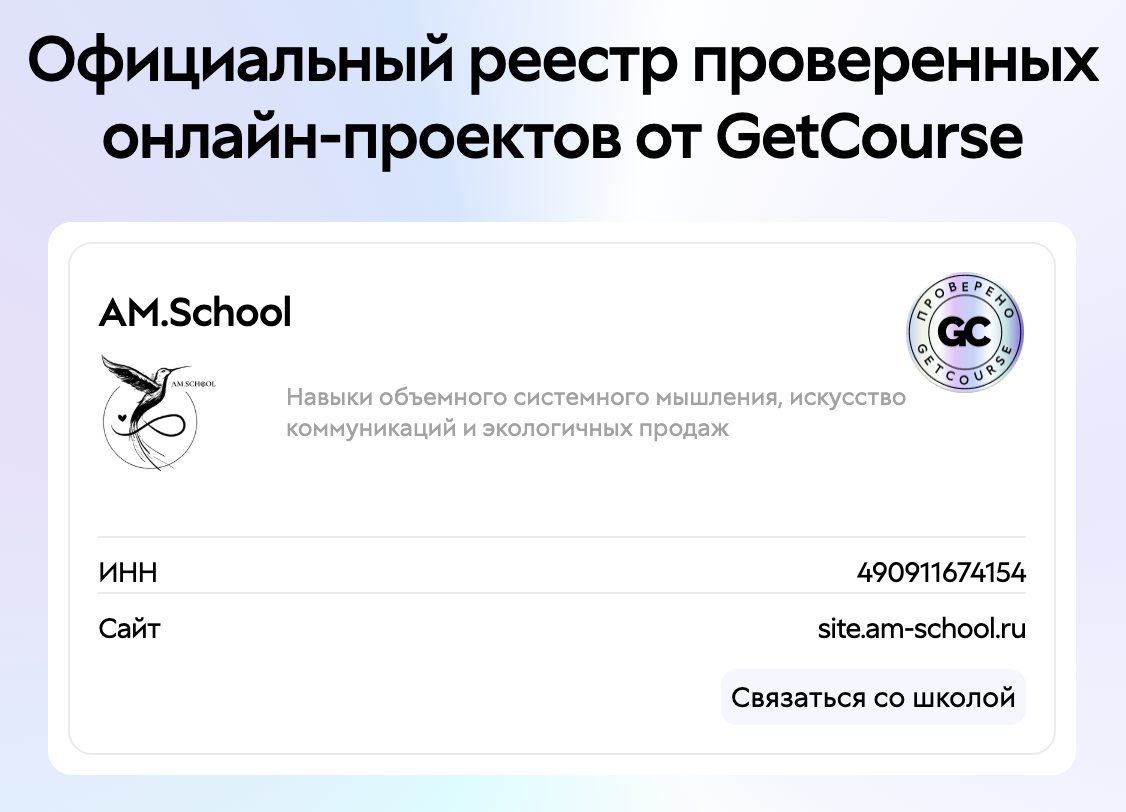 AM.School имеет Знак качества GetCourse и состоит в официальном реестре проверенных онлайн-школ